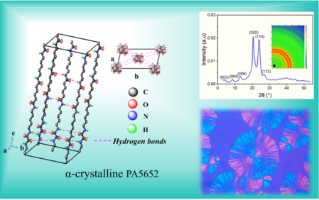 貴大新聞網(wǎng)訊(材料與冶金學院)近日,我校材料與冶金學院劉玉飛特聘教授團隊在生物基聚酰胺材料研究領(lǐng)域取得重要突破,相關(guān)成果以 Biobased Polyamide 5652 with α?Crystal Form: Characterization and Low Moisture Absorption為題,發(fā)表于高分子領(lǐng)域頂級期刊Macromolecules(自然指數(shù)期刊,中科院一區(qū)TOP)。貴州大學材料與冶金學院為論文第一完成單位,材料與冶金學院2022級碩士研究生王艷平為第一作者,劉玉飛特聘教授為通訊作者。近年來,生物基聚酰胺56(PA56)因其原料可再生、低碳環(huán)保而備受關(guān)注,但其特殊的分子結(jié)構(gòu)(戊二胺單元含奇數(shù)碳原子)導致其晶體通常以γ晶型為主,飽和吸水率高達12%以上,在潮濕環(huán)境中力學性能顯著下降(如拉伸強度降低20%-30%),嚴重限制了在精密工程領(lǐng)域的應用,而傳統(tǒng)改性方法往往以犧牲材料其他性能為代價。針對這一難題,劉玉飛特聘教授創(chuàng)新性地提出了雙氫鍵結(jié)構(gòu)調(diào)控策略:自主合成關(guān)鍵單體,設(shè)計并成功合成新型565二胺單體(C16H34N4O2),將565二胺與草酸二丁酯通過溶液聚合及